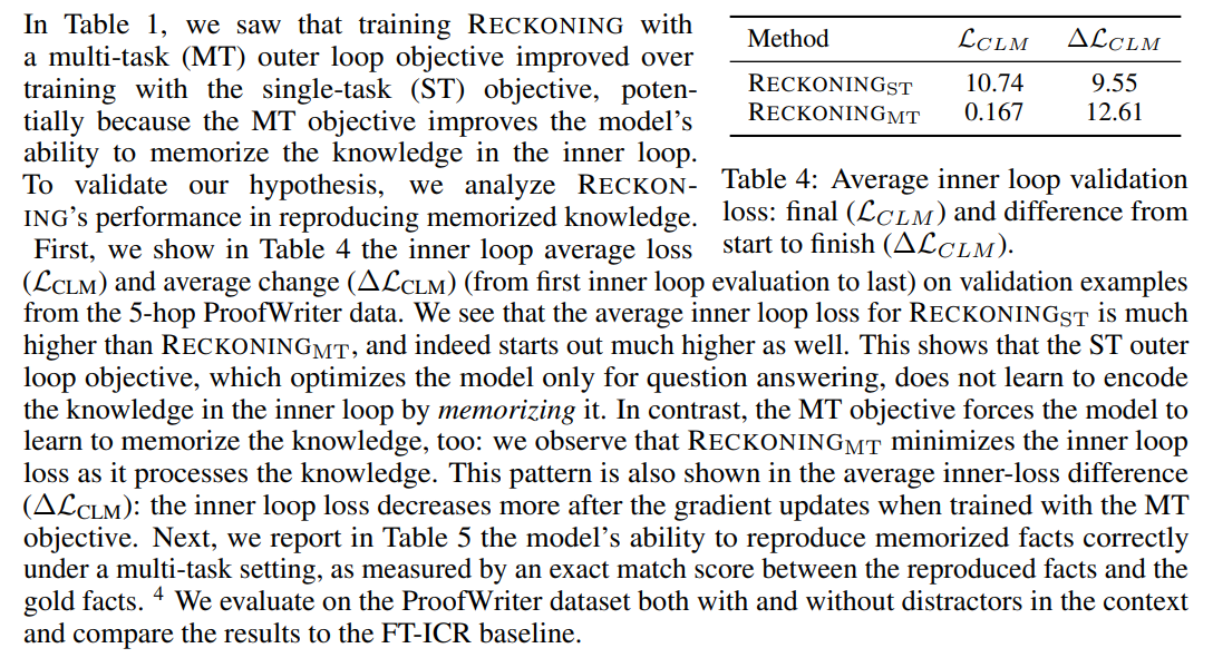 Finally, we show that RECKONING with a multi-task objective is also more robust to distractors as it trains the model to reproduce only the facts that would be relevant to a particular question we ask in the outer loop. As in Section 4.2, we use the ProofWriter dataset and, for each question, add all the distractors to the context. We train the model using the multi-task objective and report the label accuracy. While in Table 1, we originally saw a ∼ 1% improvement from training with a multi-task objective on ProofWriter with no distractors, we see a much more significant performance gap in Figure 6 (∼ 18.2%) when distractors are available. We also note that the performance of the single-task model is essentially random (see the Random-Facts baseline from Table 1). By learning how to memorize knowledge in the inner loop to recall relevant facts in the outer loop, the model also learns how to encode facts more robustly over them.